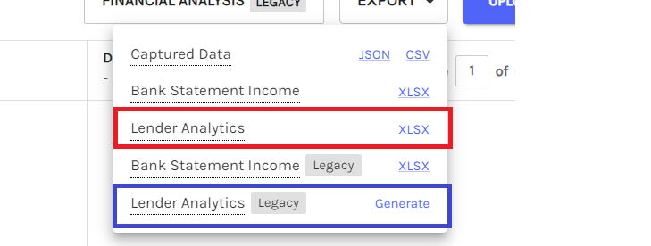Likewise, you have the option to download the 'Lender Analytics (Legacy)' by simply clicking on the 'Generate' option displayed above. A pop-up window will appear, allowing you to choose your preferred output format, either JSON or Excel.