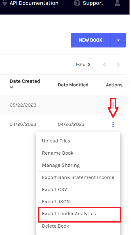 Here, you can view the list of all the books you have created. Locate the three dots situated under the 'Actions' column corresponding to the book from which you wish to download the output. Upon clicking the three dots, a drop-down menu will emerge, offering the option to 'Export Lender Analytics'.